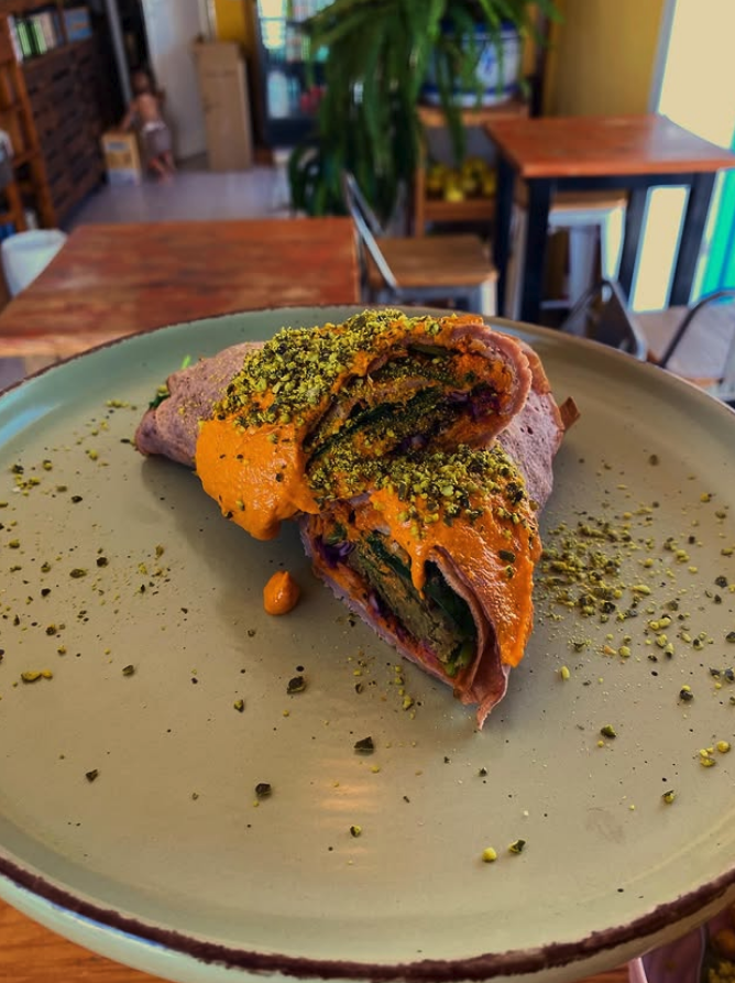 Crepes caseros rellenos de crema de dátil e higos, sin azúcar y aptos para celíacos.